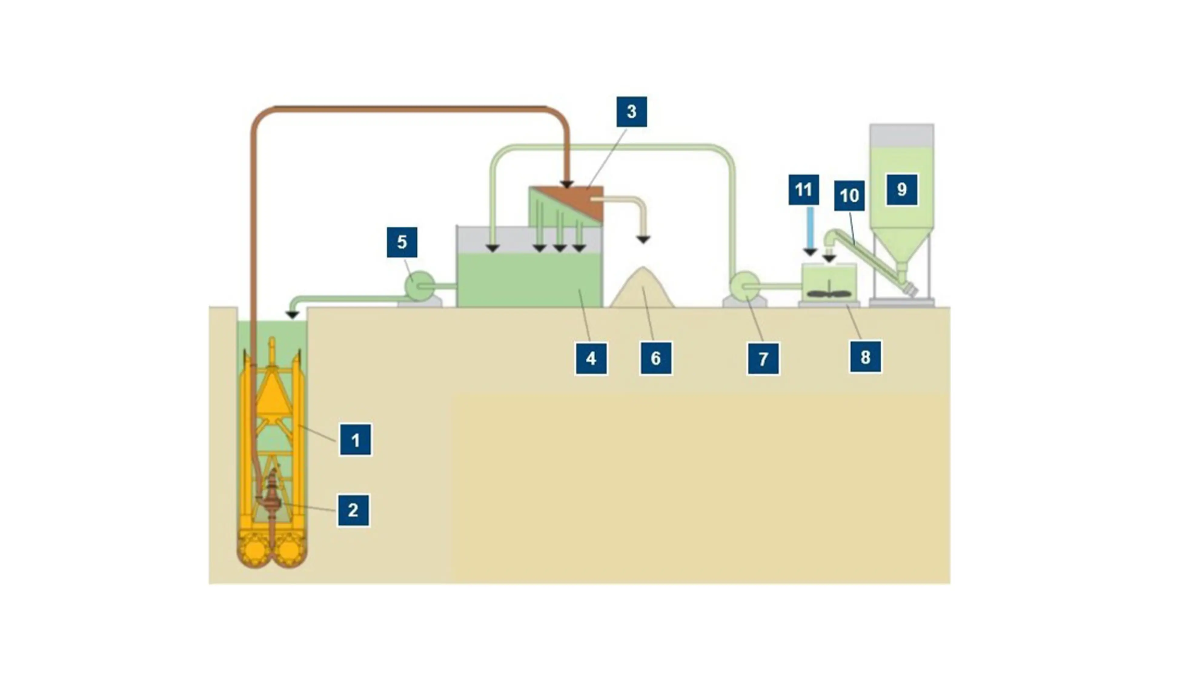 Using the pump installed in the cutter, the solid is extracted together with the slurry during the cutting process in the trench and pumped off to the desanding plant. This plant then continuously separates the solids up to a certain grain size (60 µm to 20 µm, depending on the version) out of the slurry. As a result, this cleaned slurry can be pumped directly back into the cutter-excavated trench within the closed circuit.