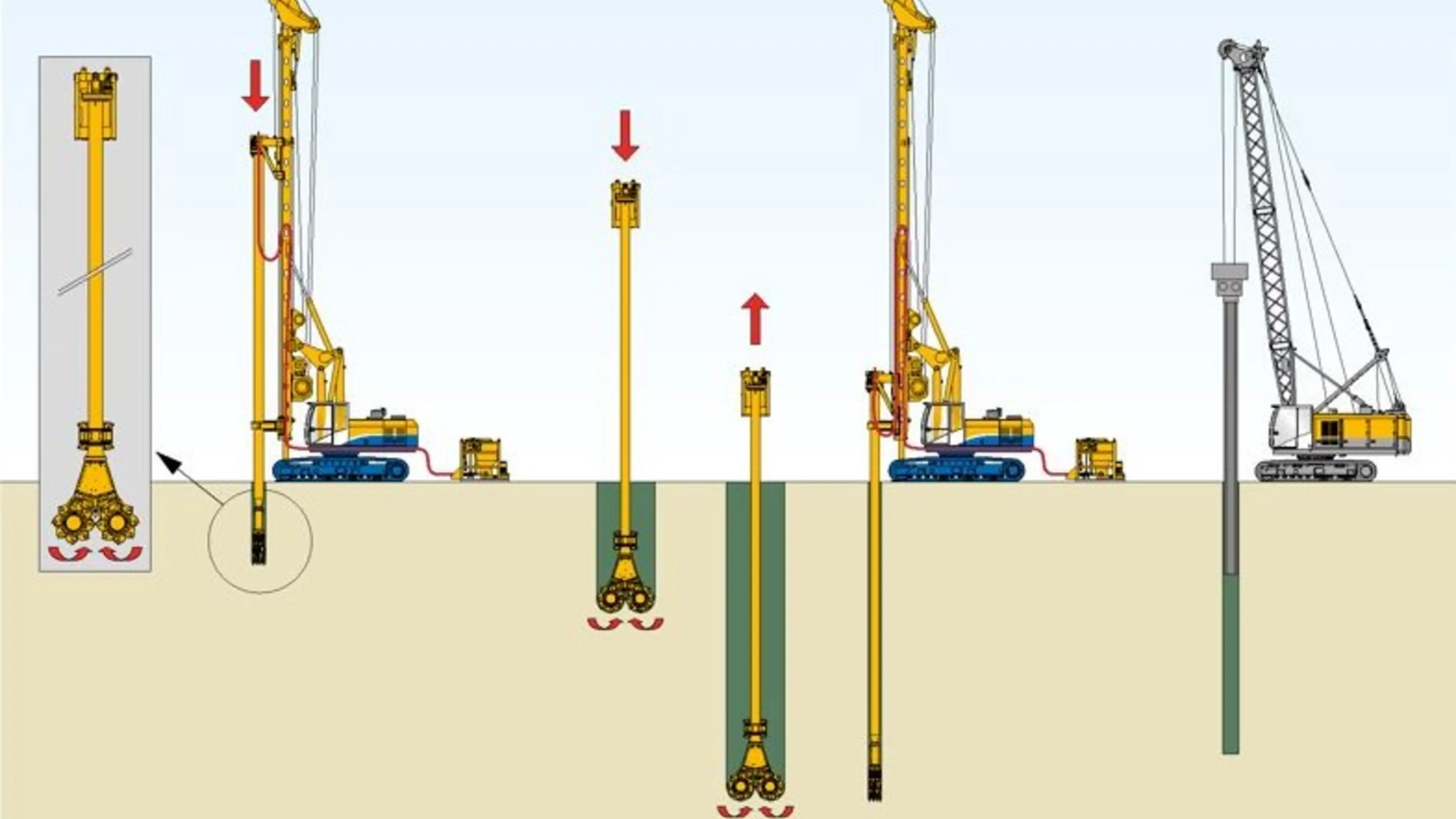 For soil mixing techniques, the existing soil is loosened using suitable mixing tools – cutting wheels for rectangular columns or mixing paddles for round columns – and blended with a slurry to form a homogeneous soil-bentonite mortar.